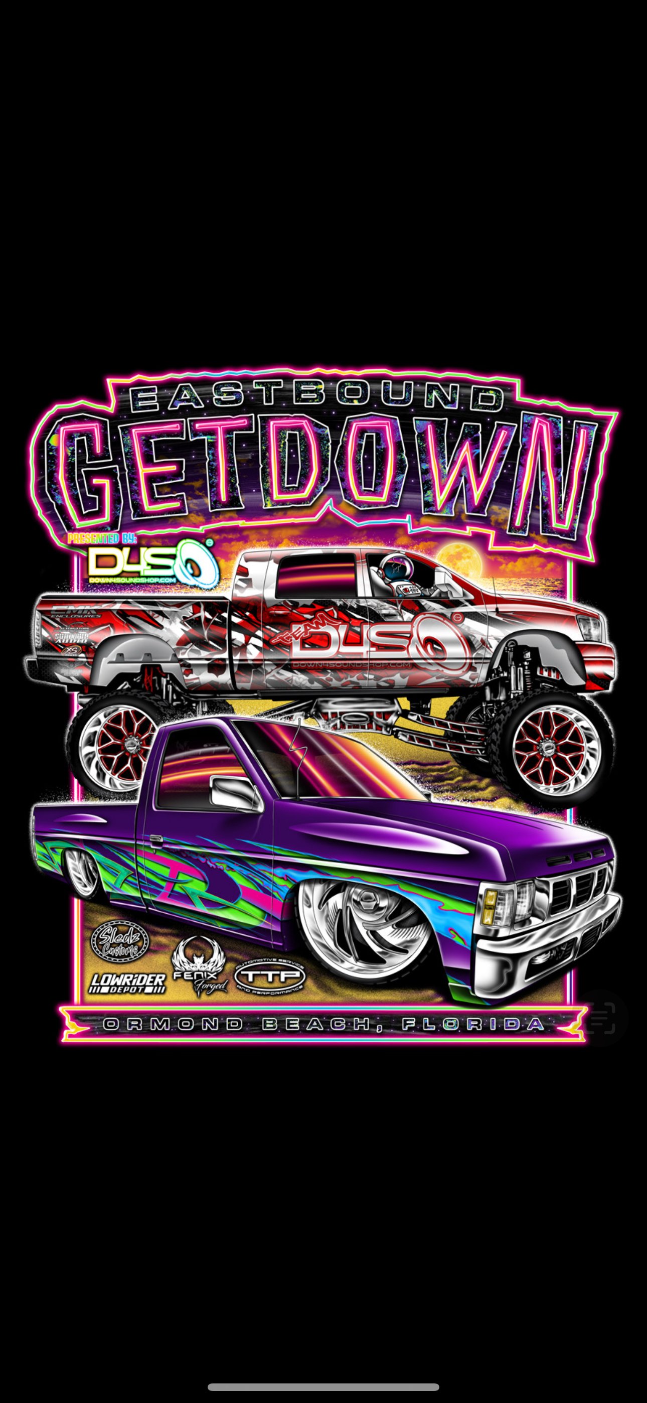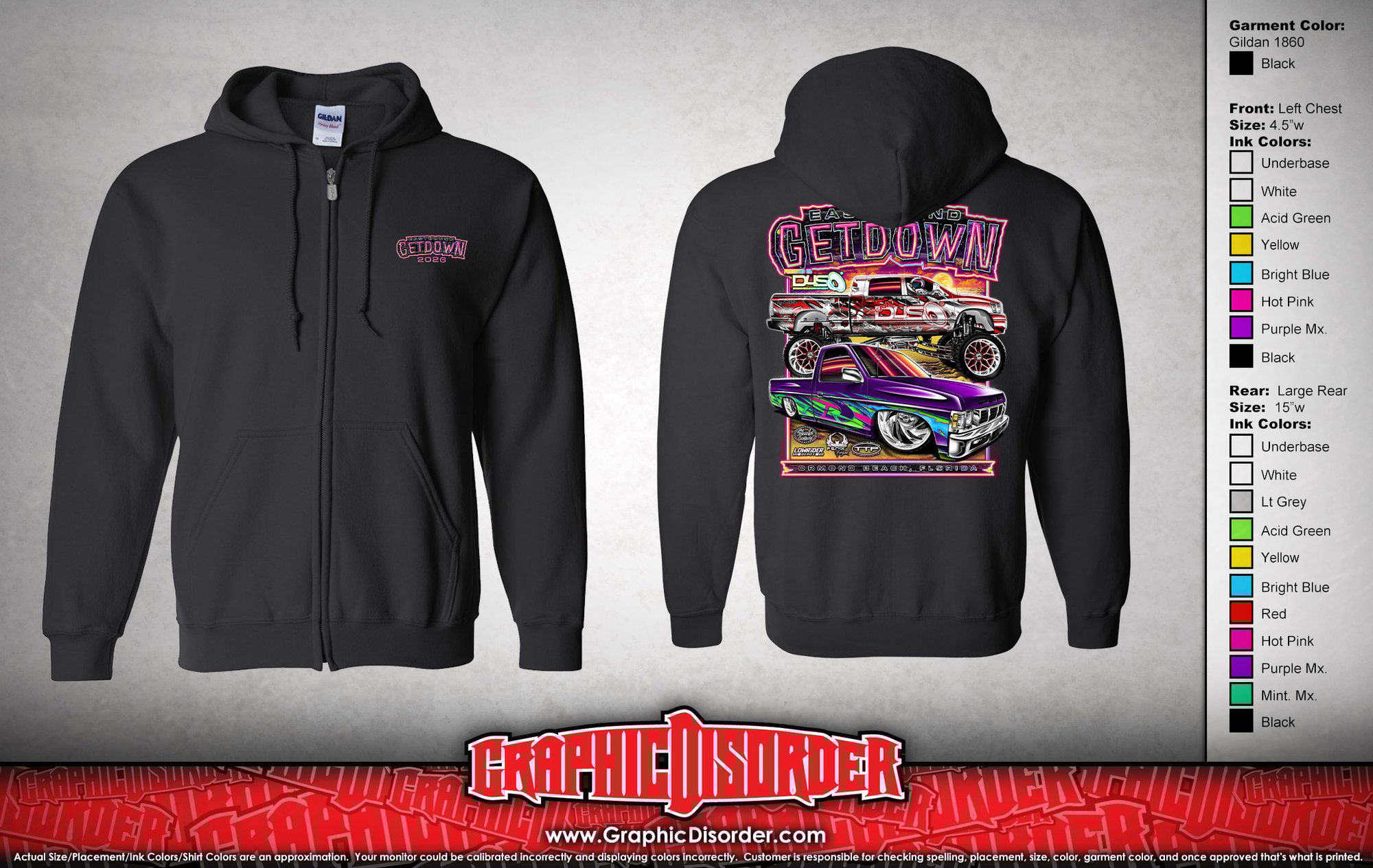 Eastbound Getdown Nighttime Artwork Zip Up/Hoodie comes in Black only! Zip up's will be Gildan Adult Heavy Blend™ 8 oz., 50/50 Full-Zip Hooded Sweatshirt! 2026 EBGD Nighttime Artwork by Graphic Disorder!! Featuring Robert Werring AKA Dirty Rob's 2008 Dodge Ram 2500 Mega Cab & Matthew Diaz's 1995 Nissan Hardbody pickup. This is a pre-sale starting October 13th running through November 15th PICKUPATEBGD2026 for FREE SHIPPING if picking up at EBGD in Jan. 2026 or pay shipping to have order shipped to your address when orders are received sometime in December 2025.