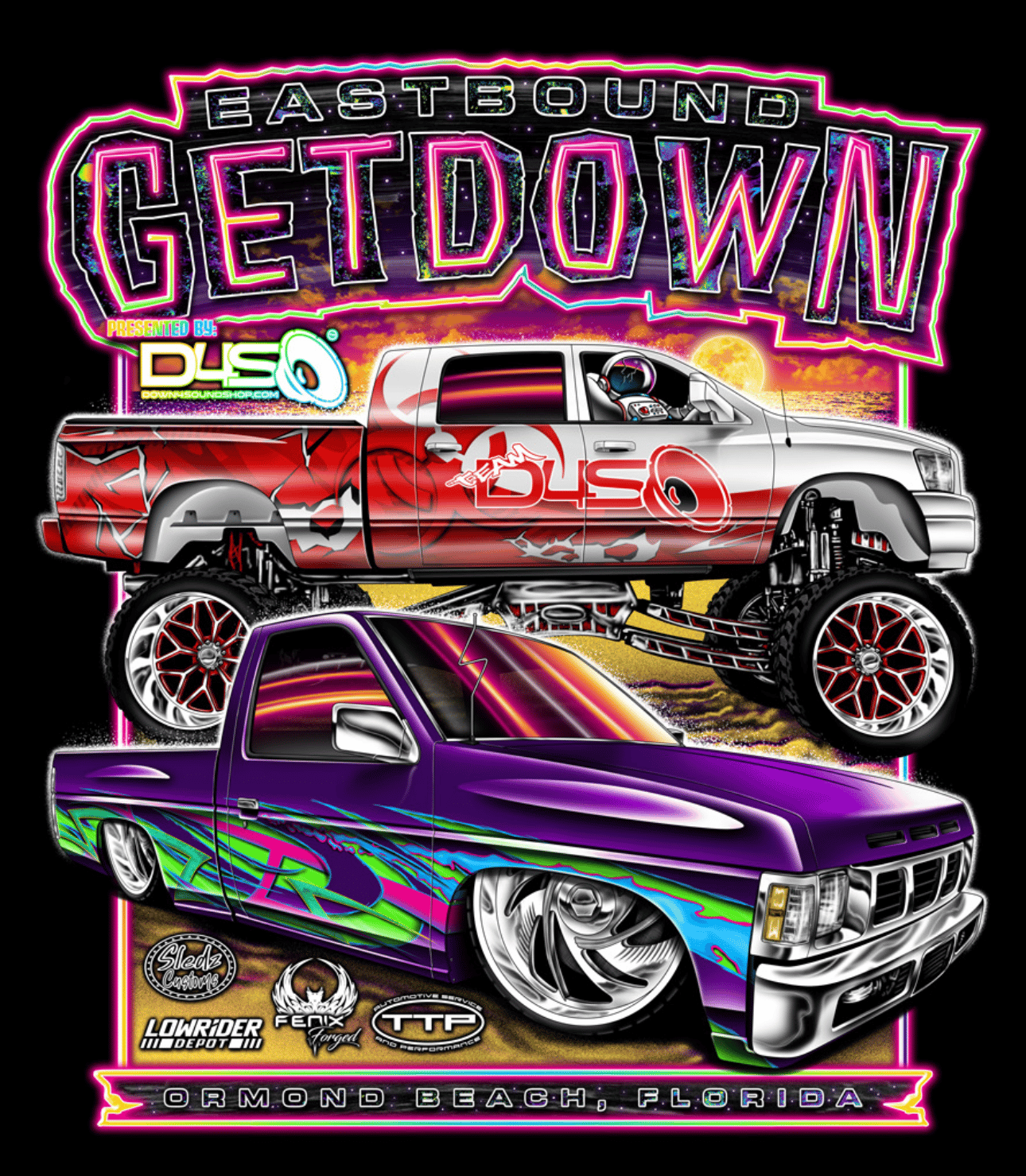Eastbound Getdown 2026 Full Color Daytime Artwork Banner featuring: 2026 EBGD Nighttime Artwork Show Shirt by Graphic Disorder!! Featuring Robert Warring AKA Dirty Rob's 2008 Dodge Ram 2500 Mega Cab & Matthew Diaz's 1995 Nissan Hardbody pick up. This is a pre-sale starting October 4th running through October 23rd. PICKUPATEBGD26 for free shipping if picking up at EBGD in Jan. 2026 or pay shipping to have order shipped to your address when orders are received sometime in December 2025 Banner Size is: 24in. Wide X 36in. Long
